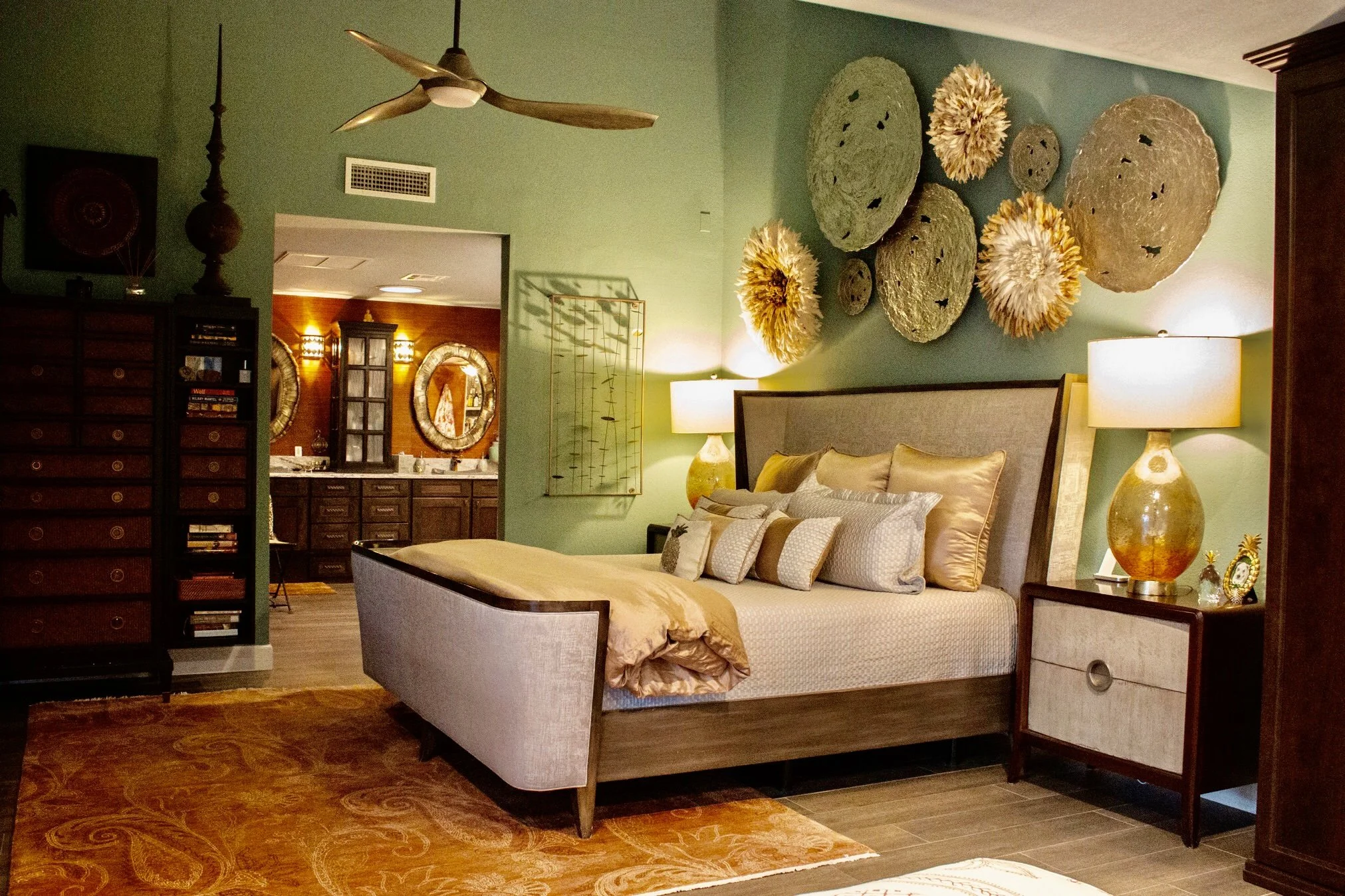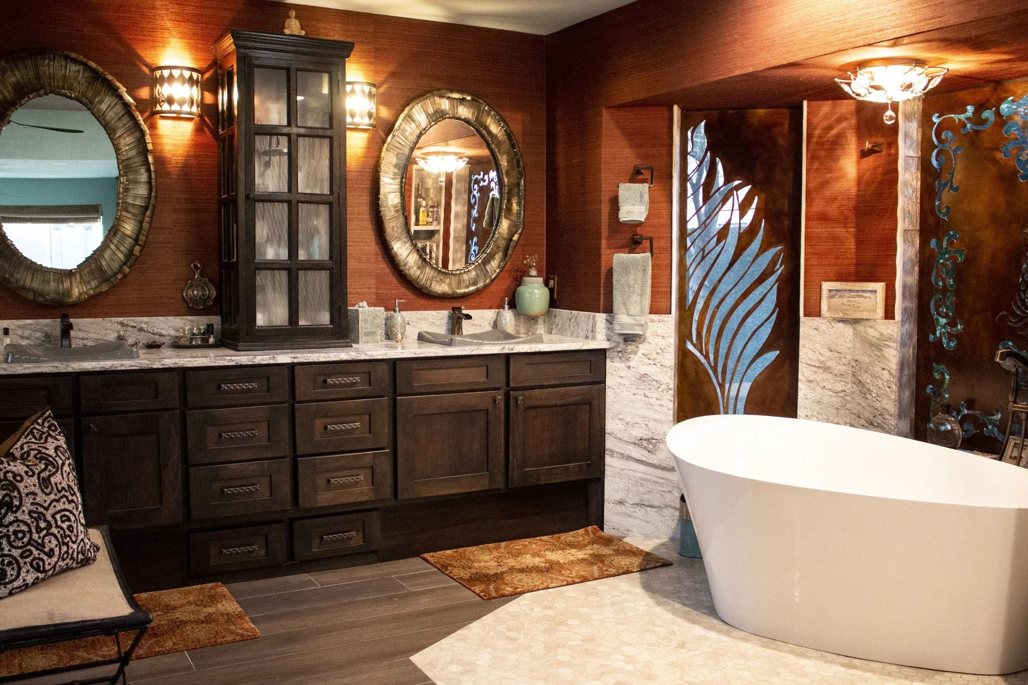 East meets West Design Concept. Her layering colors, natural stone features along with Organic touches throughout, ‘everywhere there is a reward for the eye.’