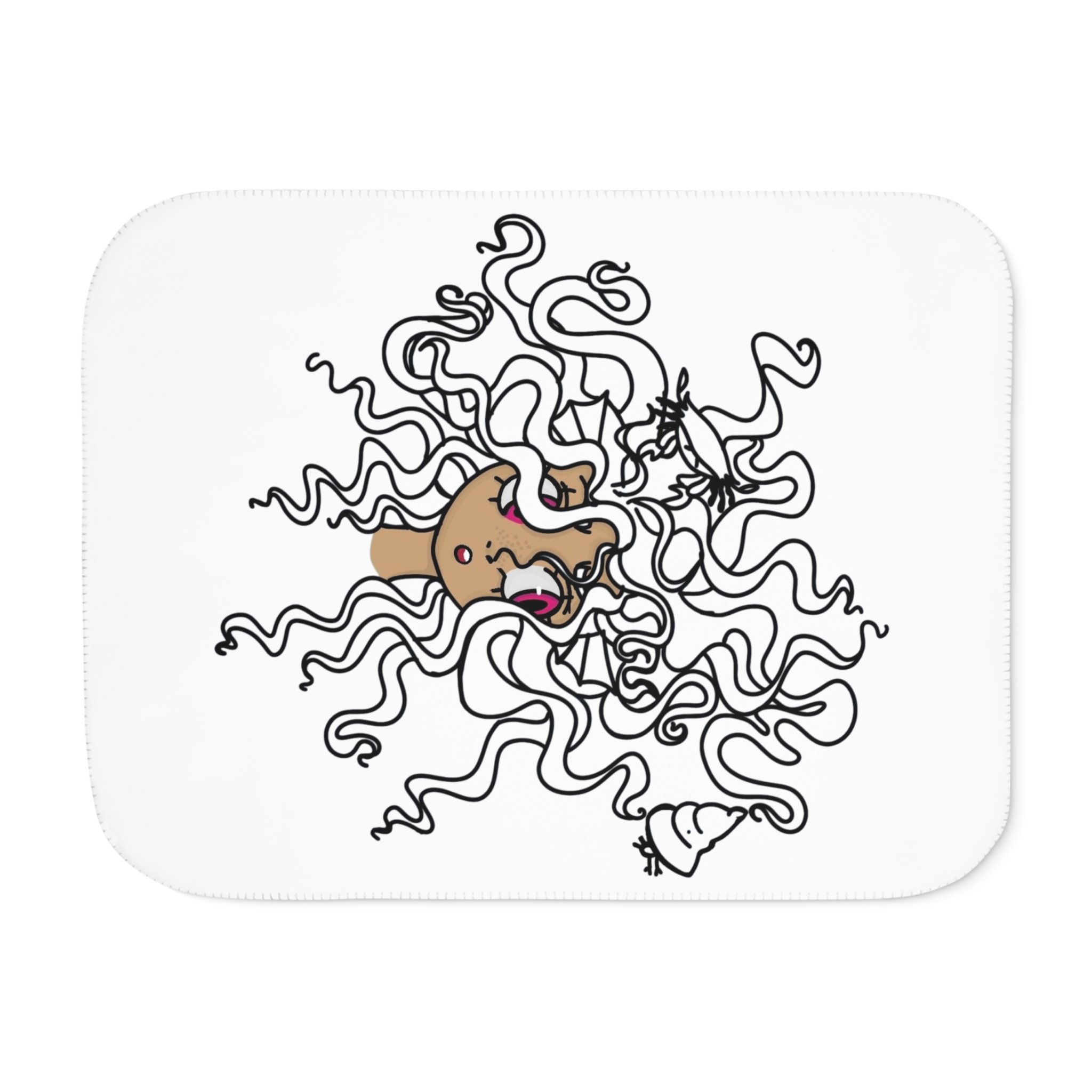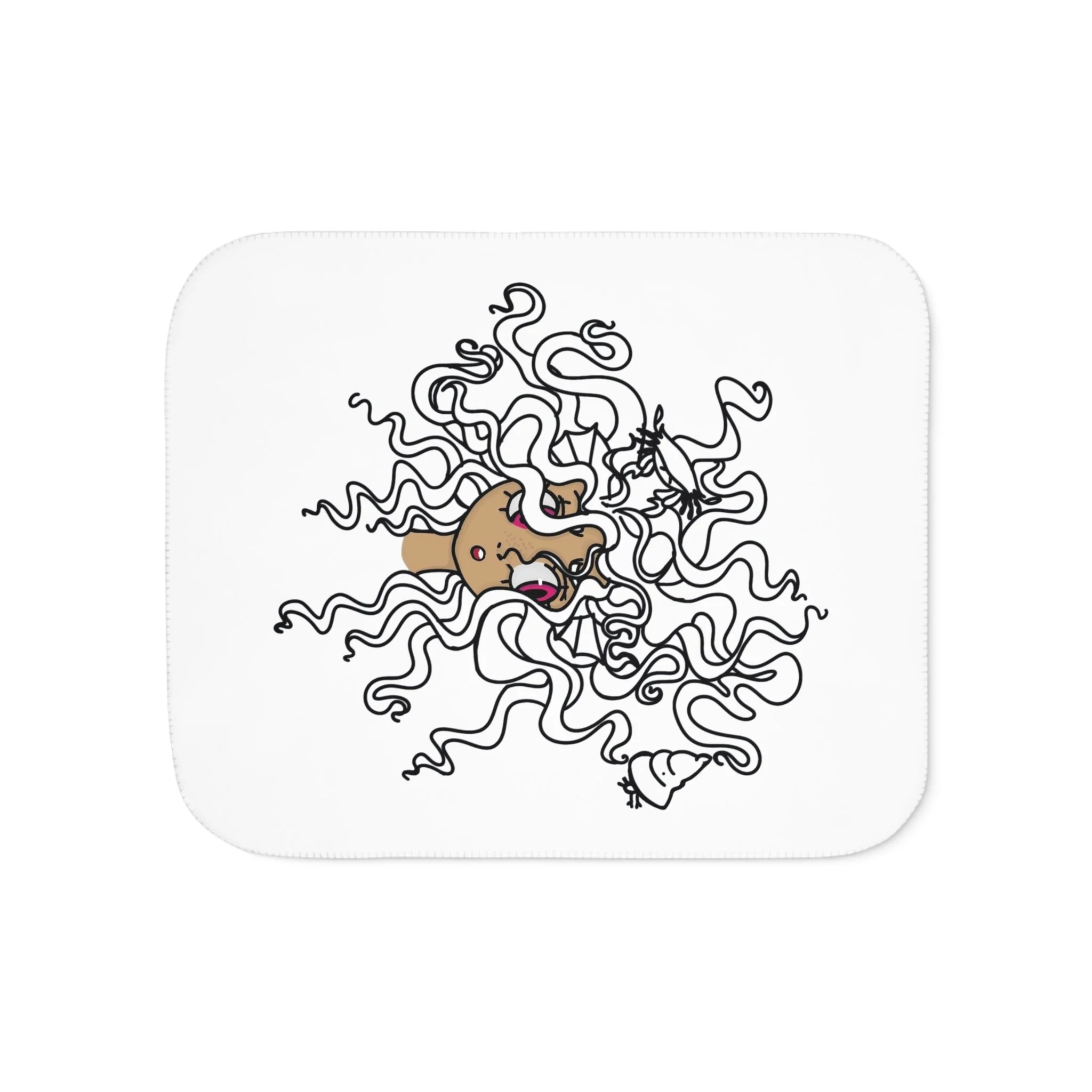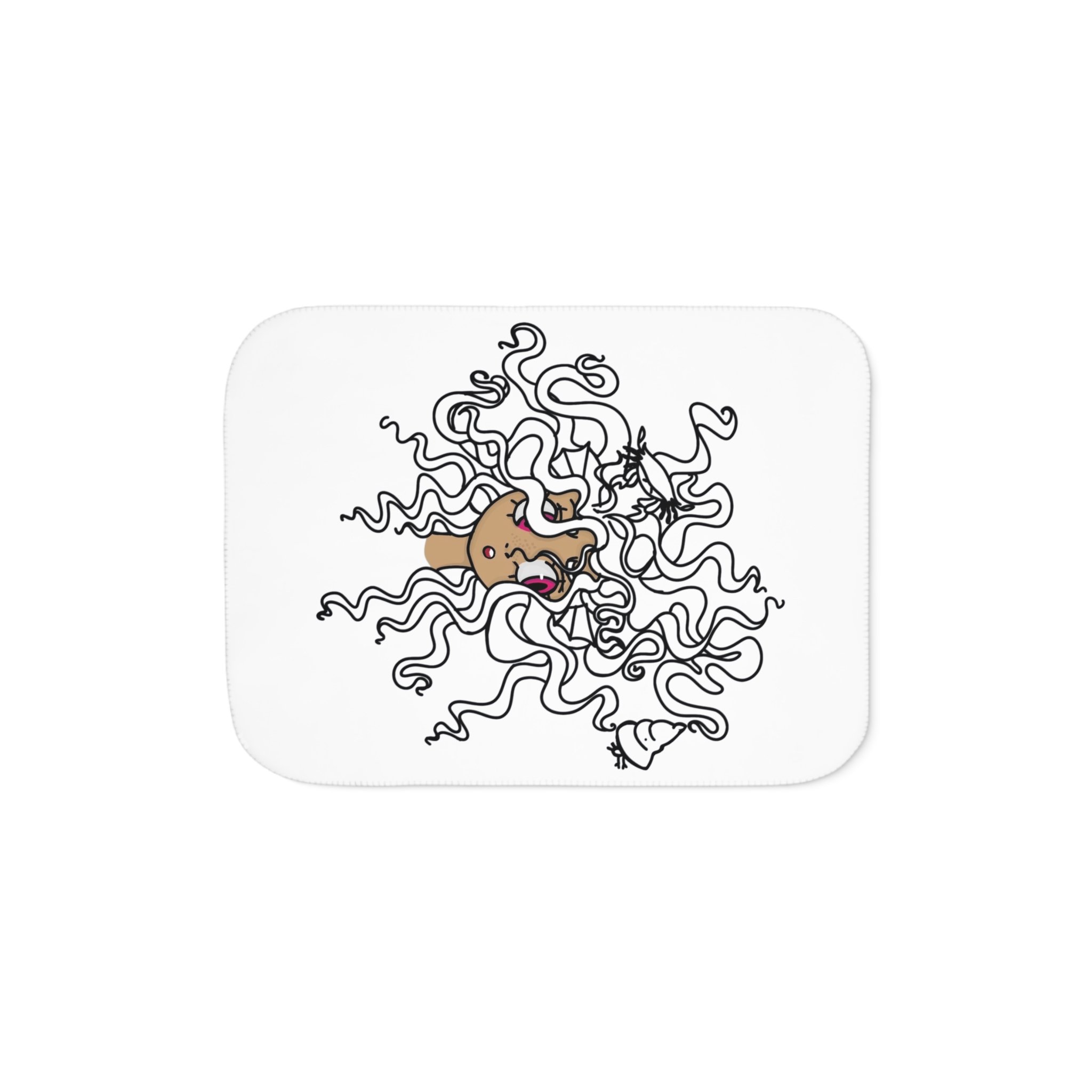 A cloud-soft sherpa blanket that wraps you in gentle warmth and playful charm. On the front, a whimsical doodle of a wide-eyed dog tangled in looping lines brings a smile and a lighthearted mood to quiet evenings. The plush sherpa backside in warm beige or cool grey invites you to sink in after long days—movie nights, reading nooks, or slow Sunday mornings. The rounded corners and decorative stitching give it a finished, cozy look that lives anywhere from a sofa arm to a bedroom corner. Lightweight yet substantial, it layers easily over bedding or folds neatly for travel. This blanket feels like a familiar friend—soft, reliable, and quietly expressive.